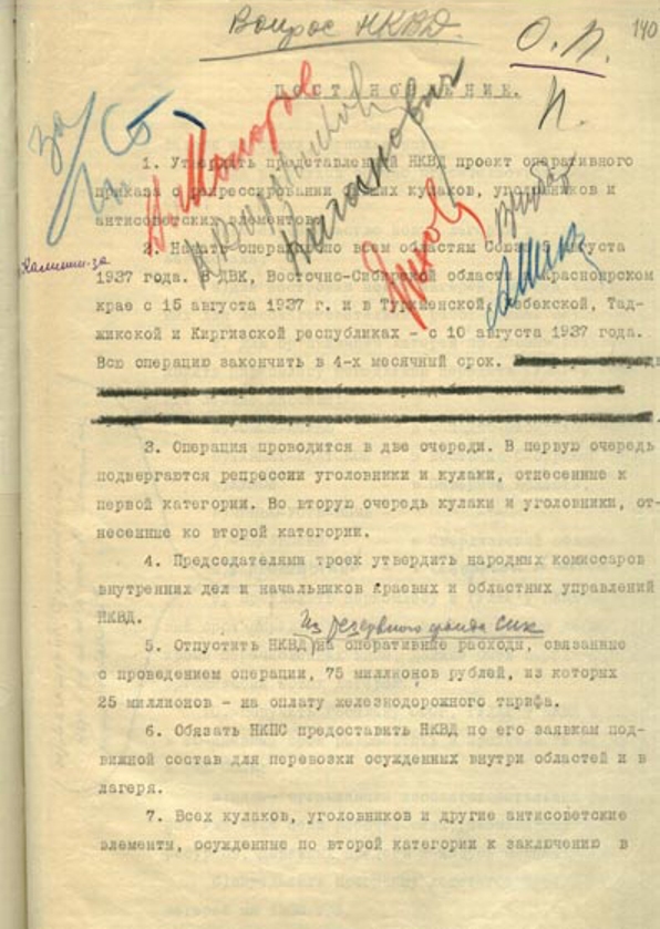 Совершенно секретный приказ наркома Н. Ежова № 0447 "Об операции по репрессированию бывших кулаков, уголовников и других антисоветских элементов" гласил: «Перед органами государственной безопасности стоит задача – самым беспощадным образом разгромить всю эту банду антисоветских элементов, защитить трудящийся советский народ от их контрреволюционных происков и, наконец, раз и навсегда покончить с их подлой подрывной работой против основ советского государства».