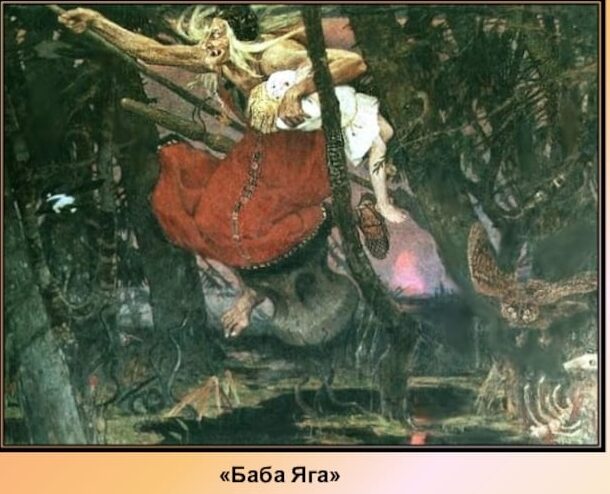 Картина В.М. Васнецова. Баба Яга изображена с летающей ступой над болотом с гадюками.