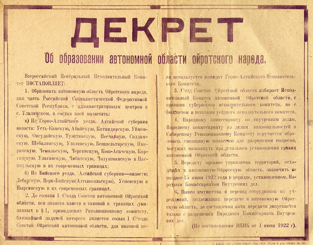 Случались курьёзы и другого типа. Когда решался вопрос о создании собственного субъекта в рамках РСФСР для алтайского народа ойратов, то указывалась сложность в реализации этой меры ввиду малочисленности коренного народа. Оказалось, что туземцы составляют на Алтае только 8,2% населения. В резолюции Сиббюро ЦК РКП(б) говорилось: «В таких условиях организовать советскую власть на огромной территории, протяжением до 1500 верст длины и 200–300 верст ширины, на национальном принципе представляется явно несущественным делом, если, конечно, авторы проекта не предполагают, по примеру Семиреченской губернии, провести широкое выселение из области русского населения. Но при указанном выше цифровом соотношении туземного и русского населения осуществление этой меры было бы ничем иным, как превращением и теперь слабозаселённого края в прямую пустыню» [3].
