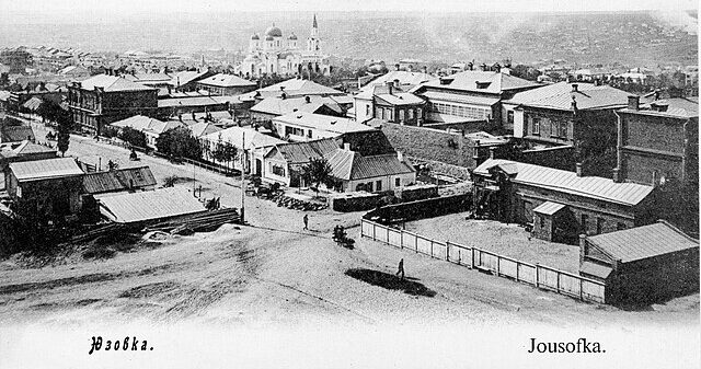 В 1869 году Джон Юз, директор Миллвольского железопрокатного завода в Великобритании, купил у князя Кочубея землю на берегу реки Кальмиус и построил здесь Юзовский металлургический завод с рабочим посёлком вблизи Александровки. Одновременно английский промышленник для накопления капитала основал «Новороссийское общество каменноугольного, железного, стального и рельсового производств» на месте залегания курных углей.