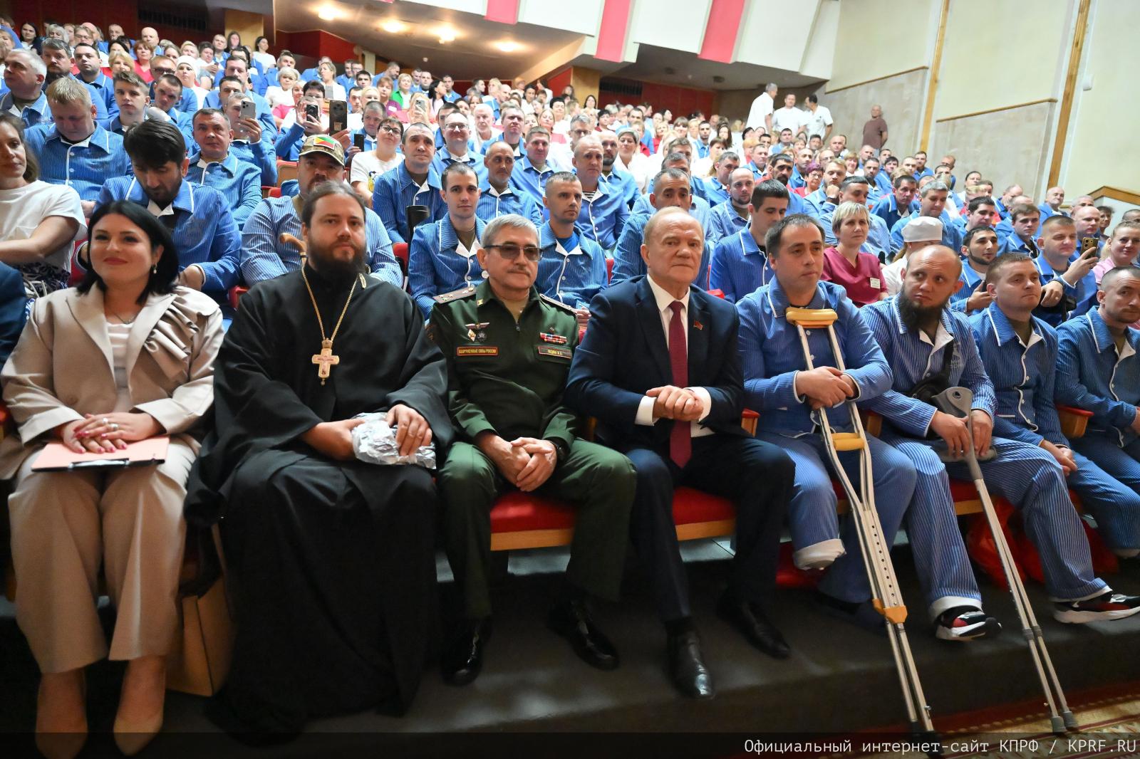 В концертном зале на 300 мест был аншлаг. Всем бойцам, находящимся на лечении и реабилитации, были вручены подарочные наборы, в которые вошли книги Г.А. Зюганова, блокноты, ручки, газета «Правда», мед и лечебный бальзам.