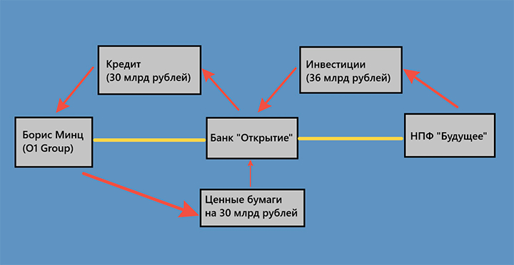 «Схема была несложной. Тогда у ЦБ было требование, что НПФ не может инвестировать более 15% своих накоплений в одном место, поэтому каждый фонд Минца скидывал по 15% в каждый банк "кольца", чтобы всё было по закону. Затем Минц получал эти деньги в качестве кредитов. Например, более 30 млрд рублей в банке "Открытие". А откуда они взялись-то изначально? Из НПФ "Будущее" — это были накопления граждан», — рассказал нам источник, связанный с аудитом НПФ.