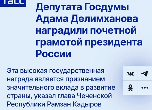 Адам Султанович Делимханов — во времена Ичкерии был личным водителем полевого командира-террориста Салмана Радуева. Затем — депутат Государственной думы V, VI и VII созывов, член партии «Единая Россия». В Госдуме России VII созыва — член Комитета по безопасности и противодействию коррупции. За свою работу он получил и другие награды, включая Героя России — высшую награду, даваемую за заслуги перед государством и народом, связанные с совершением геройского подвига.