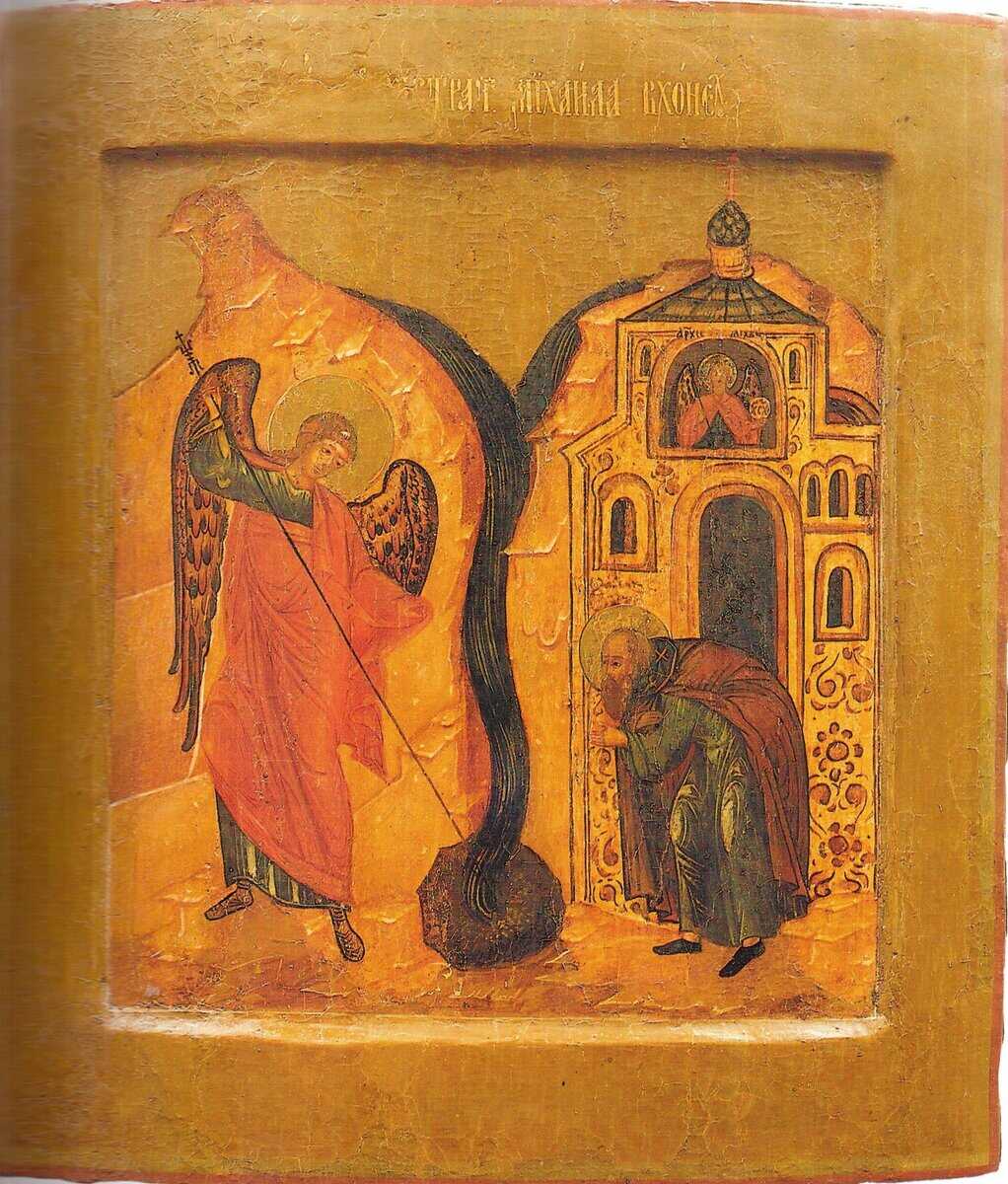 Когда воспевал сие блаженный Архипп, то услышал голос, повелевающий ему выйти из церкви. Выйдя из церкви, он увидел великого предстателя и хранителя рода христианского – святого архистратига Михаила, в образе прекрасного и пресветлого мужа, как некогда он явился пророку Даниилу (Дан. 10:1–21). Блаженный Архипп, не будучи в состоянии смотреть на него, от страха упал на землю.