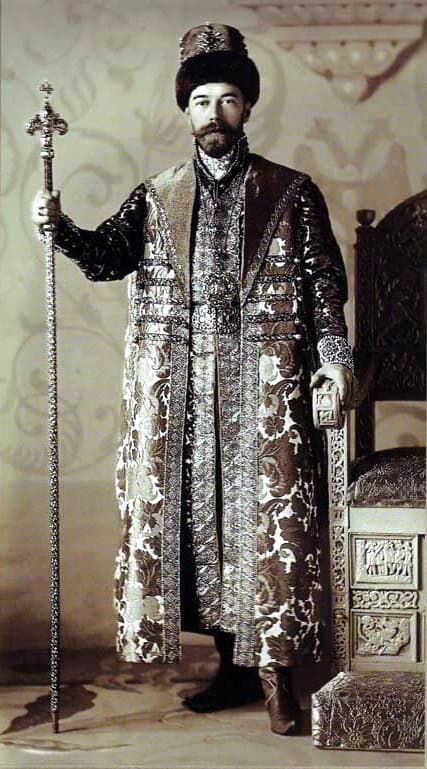 Центральными фигурами, конечно, были сами Романовы. Император Николай II был одет в костюм царя Алексея Михайловича: парчовый кафтан, расшитый золотыми орлами, скипетр и держава.