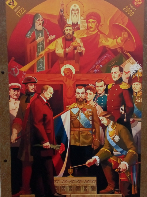 Картина про преемственность патриотизма (памяти о Козьме Минине) на протяжении всей истории... Улыбается только Коба Бесошвили в кителе генералиссимуса.... Остальные участники перформанса недоумевают или плохо загримированы...