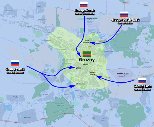 26 декабря 1994 года министр обороны Грачёв заявил журналистам: «Грозный мы штурмовать не будем. В середине января начнём выдавливать их из города». В тот же день на заседании Совета безопасности РФ было принято решение о штурме. План взятия города в ночь на 1 января предусматривал действия группировок федеральных войск с четырёх направлений: северного (генерал Константин Пуликовский), западного (генерал Иван Бабичев), северо-восточного (генерал Лев Рохлин) и восточного (генерал-майор Николай Стаськов).