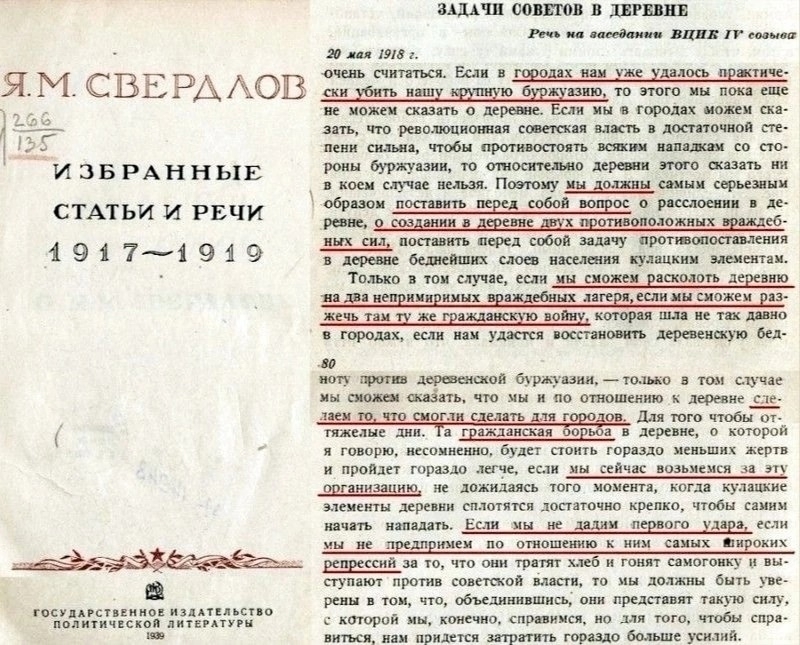 Янкель Мовшевич Свердлов - о задачах Советской властив деревне. Задачи, как видим, просты, как репка: устроить там гражданскую войну. Деревню большевики, как и все любители "прогресса" а-ля Французская революция, искренне ненавидели, и считали ее оплотом косностии консерватизма, препятствием для развития. Потому речь шла, по сути, не о "подавлении кулачества", а об уничтожении деревни вообще. В принципе, этот "результат" и был достигнут: в 1970-е гг. в деревне живут уже никакие не крестьяне, а сельскохозяйственные рабочие, а тысячи деревень и сел перестали существовать, как "непреспективные". Еще одним "результатом" стала продовольственная зависимость России - а закупали не только зерно. Когда в конце 80х стали все же раздавать земельные участки желающим, их оказалось особо некому и брать, почти все нынешние фермеры - горожане, часто - не в одном поколении. Марксисты давали "установку": преодолеть противоположность между городом и деревней. В итоге - исчезла деревня. "Установку" Маркса большевики выполнили - но таким путем, как если бы лечили плоскостопие ампутацией ступней ног...