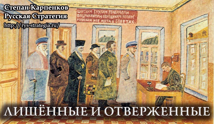 – Под «народную власть» подводилась «законодательная» база – по злой воле большевицких самозванцев таким образом узаконивалось беззаконие. Принятая конституция законодательно закрепляла нераздельную власть большевиков. Она якобы гарантировала демократические права гражданам, но далеко не всем. Конституционное ограничение гражданских прав, широко известное как лишение прав, касалось в той или иной мере всех слоёв населения многонационального государства.