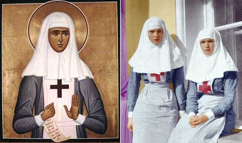 На фото: Икона святой страстотерпицы Государыни Императрицы Александры Фёдоровны. Августейшие сёстры милосердия Великие княжны Ольга Николаевна и Татьяна Николаевна у Царскосельского лазарета, 1916 год.